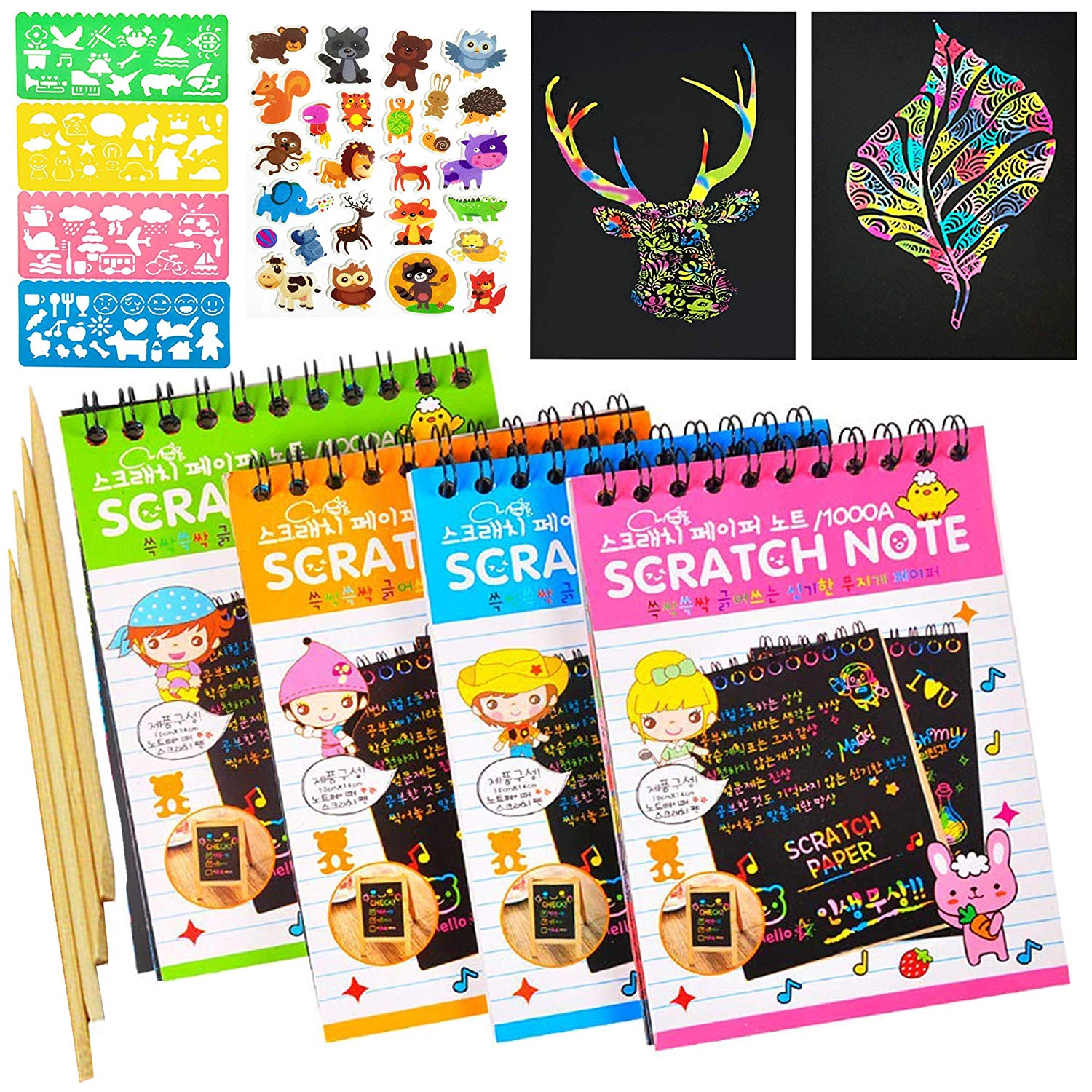 Package includes: 4 colorful notebooks, 4 wooden styluses, 4 drawing stencils and animal stickers.